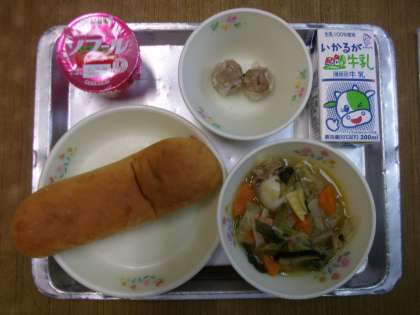 5月31日の給食は「コッペパン、牛乳、八宝菜、焼シューマイ、ヨーグルト」でした。