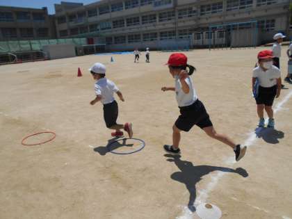班によって違うくねくねやジグザグのオリジナルコースを,鬼にタッチされないように駆け抜けます。見事逃げ切ると,お店やさんに拍手してもらえました。