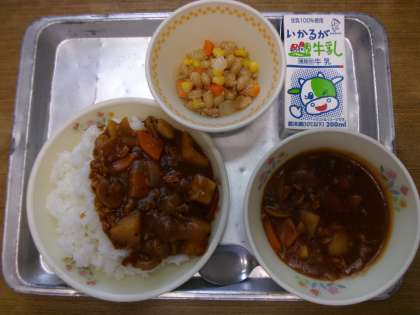 6月1日の給食は「ハヤシライス、牛乳、ビーンズサラダ、手づくりドレッシング」でした。豆が苦手な児童が多いですが、頑張って食べようとする姿も見られました。