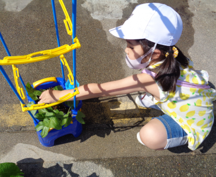 アサガオに肥料をあげたり、支柱を立てたりしました。大きくなあれ!