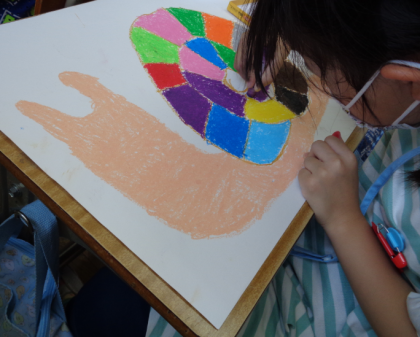 かたつむりの完成です!色の配置を自分で考えながら、しっかり塗り込むことができました。あじさいや雨も描きました。