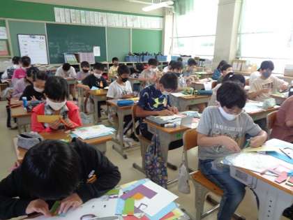 今日の図工は,台紙の飾りつけを頑張りました。画用紙の配色を工夫しながら作成していました。