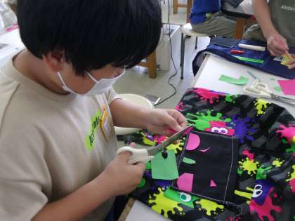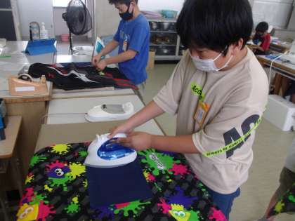 エプロンを縫い終わると,ポケットの飾りつけに入りました。糊付きの面を間違えないように,生地をデザインに合わせて置いていきました。アイロンがけも円を描くように10秒数えながら進めていきました。