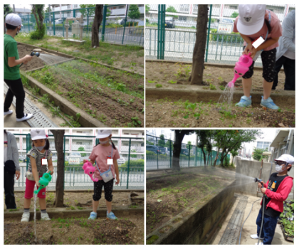 学習園の水やりに行きました。ホースが植木鉢に絡まって困っていると、偶然居合わせた3年生が、何も言わずにサッと手伝ってくれました。みんなで「ありがとう!」とお礼を言いました。素敵な交流ですね。