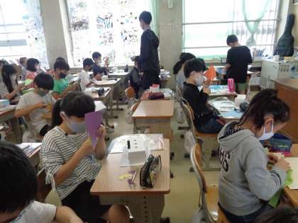 今,学習している「くるくるクランク」では,色画用紙を使って作成しています。動きに合わせてどんな世界にするのか,イメージを膨らませながら作っています。