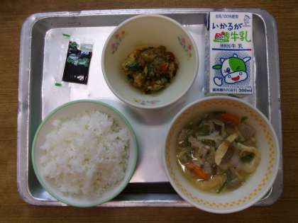 6月8日の給食は、歯と口の健康週間献立「ごはん、豚汁、カルちゃん焼き、手作りソース、のりの佃煮」でした。