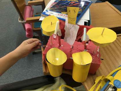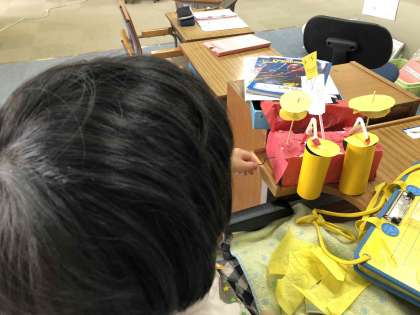 クランクの仕組みを上手に使ってドラムを叩く作品ができました。
