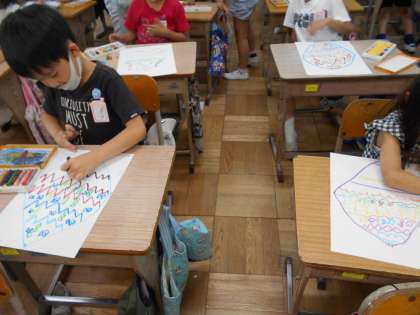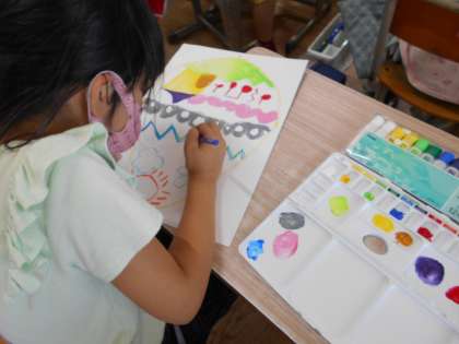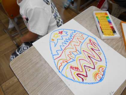 クレヨンで線が描けたら,絵の具で色を塗りました。カラフルでかわいいたまごになりそうです。