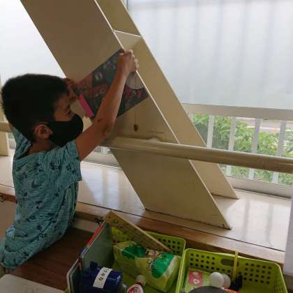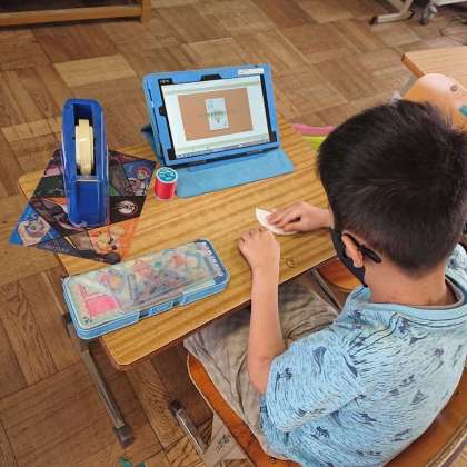 タブレットの動画を見ながら,かたむき分度器を作っています。