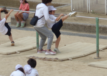 鉄棒の学習が始まりました!『コウモリ』はちょっぴり怖いので、片足から挑戦です。