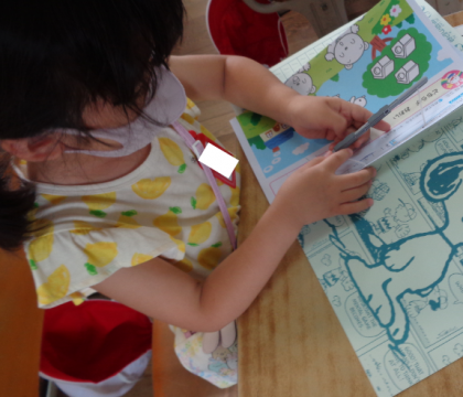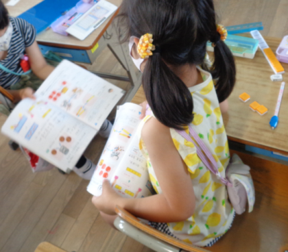 ブロックを使って足し算の学習をしました。隣の友だちと確認しています。その後は、初めてのテスト返しがありました。初めてのテストファイルにドキドキしています。上手に二穴を通すことができました。