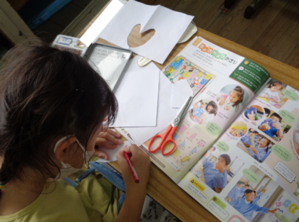 はさみの学習です。ハート形に切り、赤色で塗りました。上手にできたので、「教室にも飾りたいけど、お家にも持って帰りたい!」と悩んでいました。