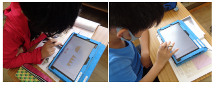 『円の面積』の学習をしています。円を細かいパーツに分けて並べ替えることで、長方形の面積を求める公式「たて×よこ」で考えればいい、ということを学習しました。並び替える動画をタブレットで見て、「縦は半径なんだね。」、「横は円周の半分の長さになってる!」と気付いていました。