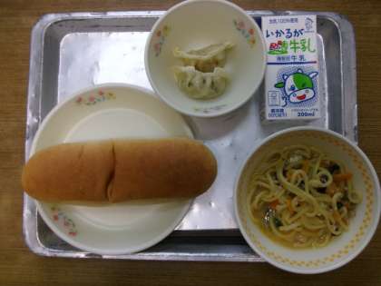 6月16日の給食は「コッペパン、牛乳、小松菜のタンタン麺、焼ギョーザ」でした。