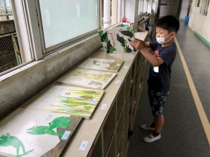 38冊のレオ=レオニ作品が2年生の靴箱の上に並べられています。