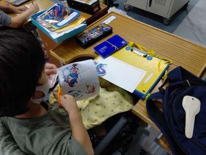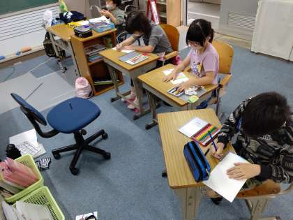 なかよしタイムで,日めくりカレンダー作りの続きをしました。今日は,台紙の飾りつけをしました。色鉛筆で色を塗った後,好きなキャラクターのイラストを切って貼り付けました。