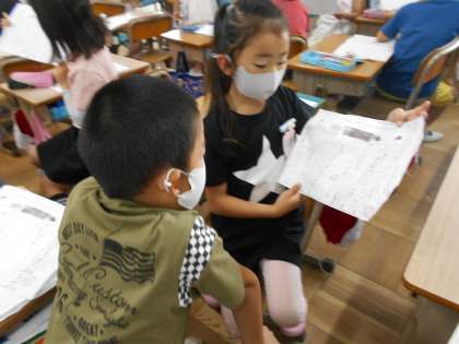 「スイミー」のあらすじをまとめた紹介文を,友だちと読み合いました。おうちの人にもぜひ紹介文を読んで,伝えてみてほしいと思います。