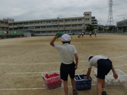 前方支持回転とスポーツテスト種目「ソフトボール投げ」の練習をしました。