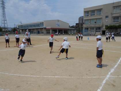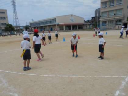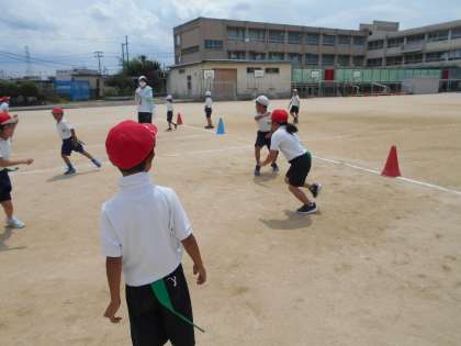 「タグカバディ」をしています。作戦が練りに練られて,攻める方も守る方も,得点が難しくなってきました。友だちの工夫を聞きながら,いろいろな作戦を試しました。