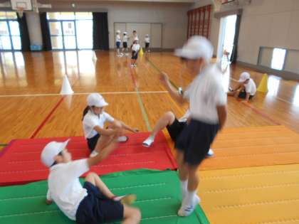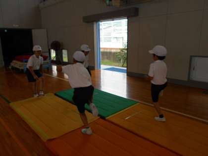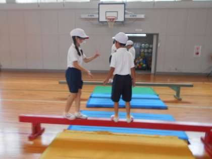 1学期最後の体育館体育は,「バランスゲーム」で楽しみました。平均台が楽しいようで,友だちと協力しあって上手に渡っていました。