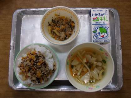 今日のそぼろ丼には、ひじきも使いました。ひじきの煮物は苦手で残す児童も多いですが、そぼろ丼にすると食べやすかったようです。