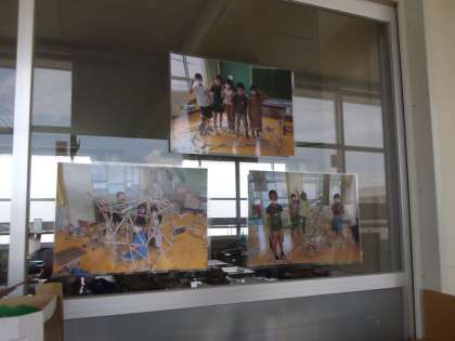 図工「つなぐんぐん」の学習の写真を掲示しています。新聞紙を細く丸めて棒状にしていきました。それを使って,船や家を作りました。