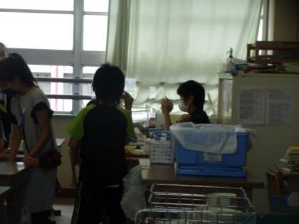 日直が給食のあいさつをします。友だちと一緒に「ごちそうさまでした」と言えました。