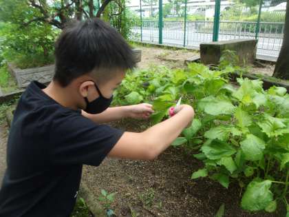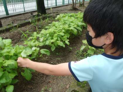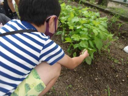 学習園の大葉を収穫しました。「大きい大葉がとりたい!」と一生懸命に探している姿が見られました。