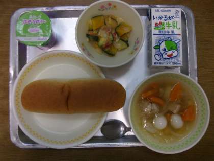 7月19日の給食は「コッペパン、牛乳、コーンスープ、夏野菜グラタン、フルーツゼリー」でした。