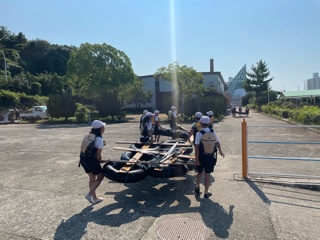 楽しく活動したいかだをチームで運び、倉庫へ片付けました。暑い中でしたが、みんな笑顔で活動することができました。