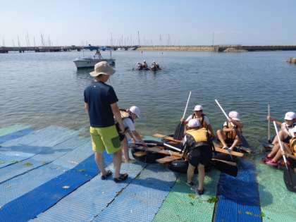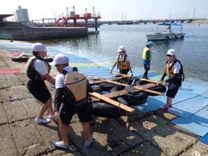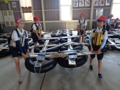 いかだの上でお互い水をかけあったり,ボールを拾いにいったりと