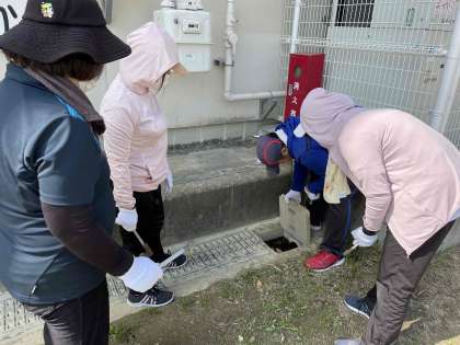 子どもたちの安全を守るため,運動場の側溝や学習園や校舎の裏など,教職員でセアカゴケグモ駆除をしました。