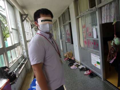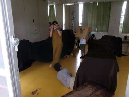 のびのびルームに来ている子たちが生活科ルームでお化け屋敷をしていました。先生たちも招待してもらいました。暗さを出すためにカラーフィルムを貼った眼鏡をかけてしていました。