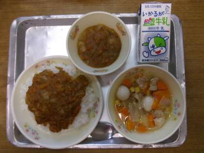 8月27日の献立は「ごはん、牛乳、野菜スープ、ドライカレー」でした。