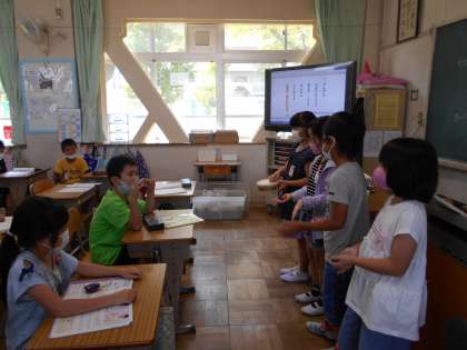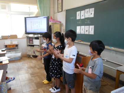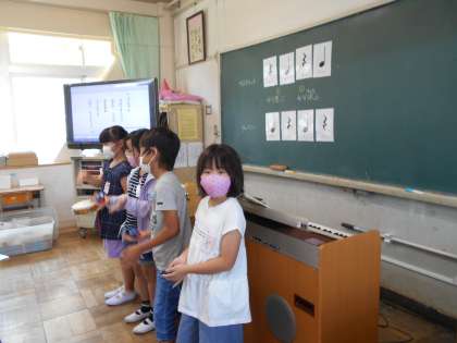 四分音符と四分休符を組み合わせてリズムを作り,音楽に合わせて合奏しました。