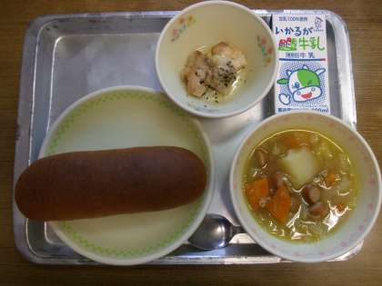 8月30日の給食は「コッペパン、牛乳、スープ煮、鶏肉の香草焼き」でした。