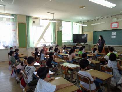 1年生の1時間目が始まる前の様子です。 先生のお話をしっかりと聞いています。
