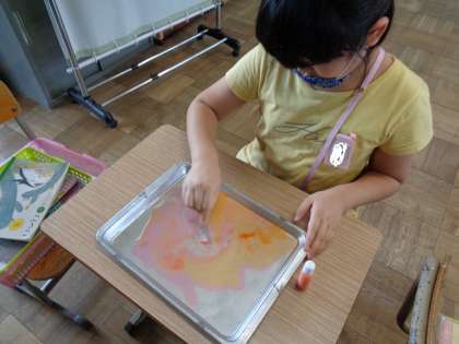 今日のメンバーは,水にインクを落として混ぜる『マーブリング』制作を行いました。