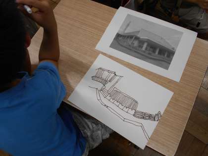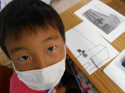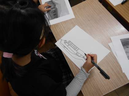 「わたしたちの学校」をテーマに絵を描きました。写真を見ながら,ていねいに線をかき込んでいました。
