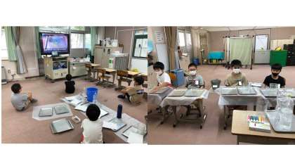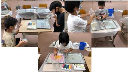 動画を見て,やり方が分かった後,水2デシリットルを測って,お盆に注ぎました。