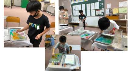 そこへ,マーブリング専用の絵の具を1滴たらします。