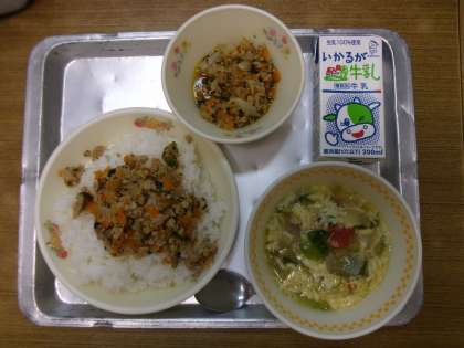 9月3日の給食は「ごはん、牛乳、レタスとトマトの卵スープ、ガパオ」でした。