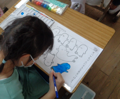 初めての絵の具。朝からずっと楽しみにしていました。使い方を知り、枠からはみ出さないように丁寧に塗っていました。