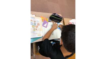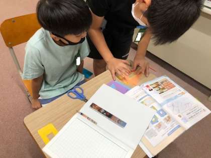 「垂直」と「平行」を学習したので,今日は,巻末の穴の空いたカードを切り取り,そのうちの2枚を重ねてできる四角形をノートに描きました。