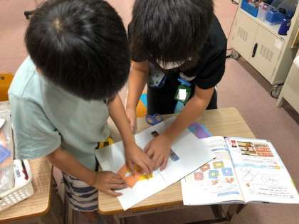 重ね方をいろいろ工夫しながら,教えあいをしながら,楽しそうに四角形を何個も描くことができました。