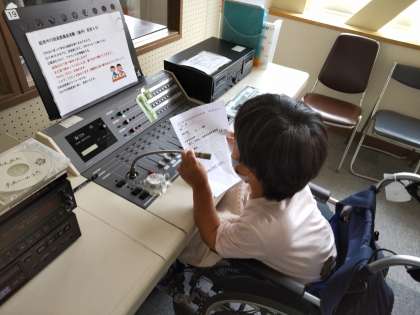 給食の放送でおすすめの本の紹介をしています。