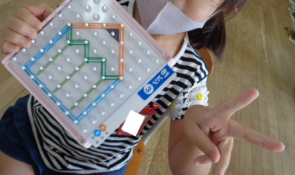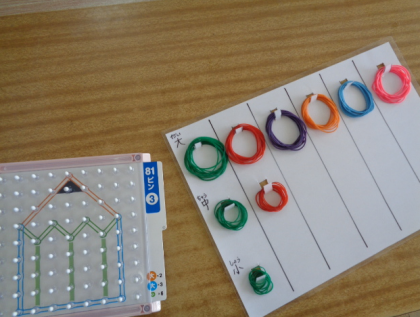 つみきは、手本では見えない部分も考えて配置することができました。パターンボードは81ピンにレベルアップしましたが、頑張っています。輪ゴムを整理するとスムーズに選べていました。大きさ比較や、「大・中・小」の漢字にも親しむ機会となっています。