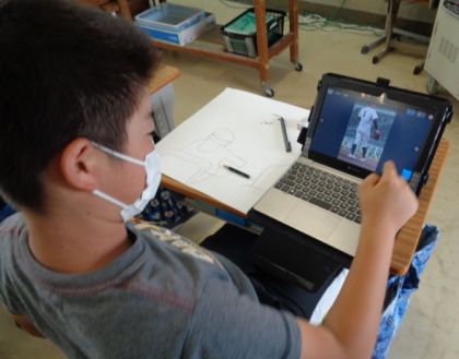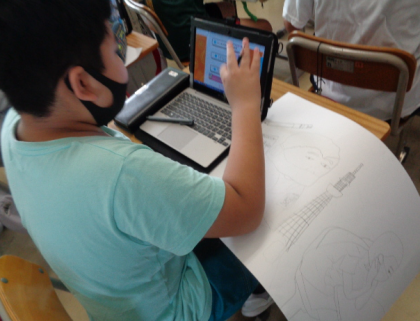 構成をよく考えて下書きしていました。タブレットを使用し、タッチペンで輪郭をなぞって練習をする等、丁寧に取り組めていました。