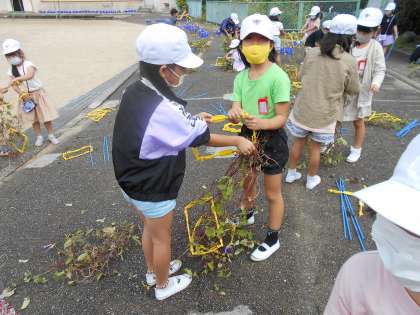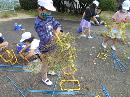 よく伸びたツルに悪戦苦闘しながらも,うまく丸めることができていました。