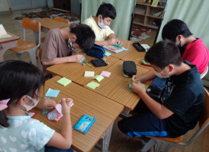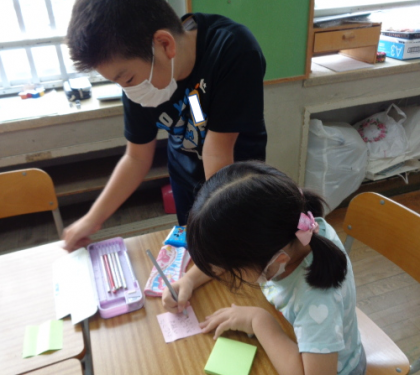 つまようじで穴をあけて、ミシン目(切り取り線)を作りました。プチプチ穴のあく感覚、ミシン目に沿って破る感覚に楽しそう♪完成しても、嬉しさのあまり、ついビリビリ破ってしまっていました。「こんな簡単に作れるんや!」、「2枚目つくろう!」と意欲的に活動していました。6年生が1年生に優しくアドバイスをしてくれました。肩たたき券、手伝い券、マッサージ券などにしました。敬老の日のプレゼントです。